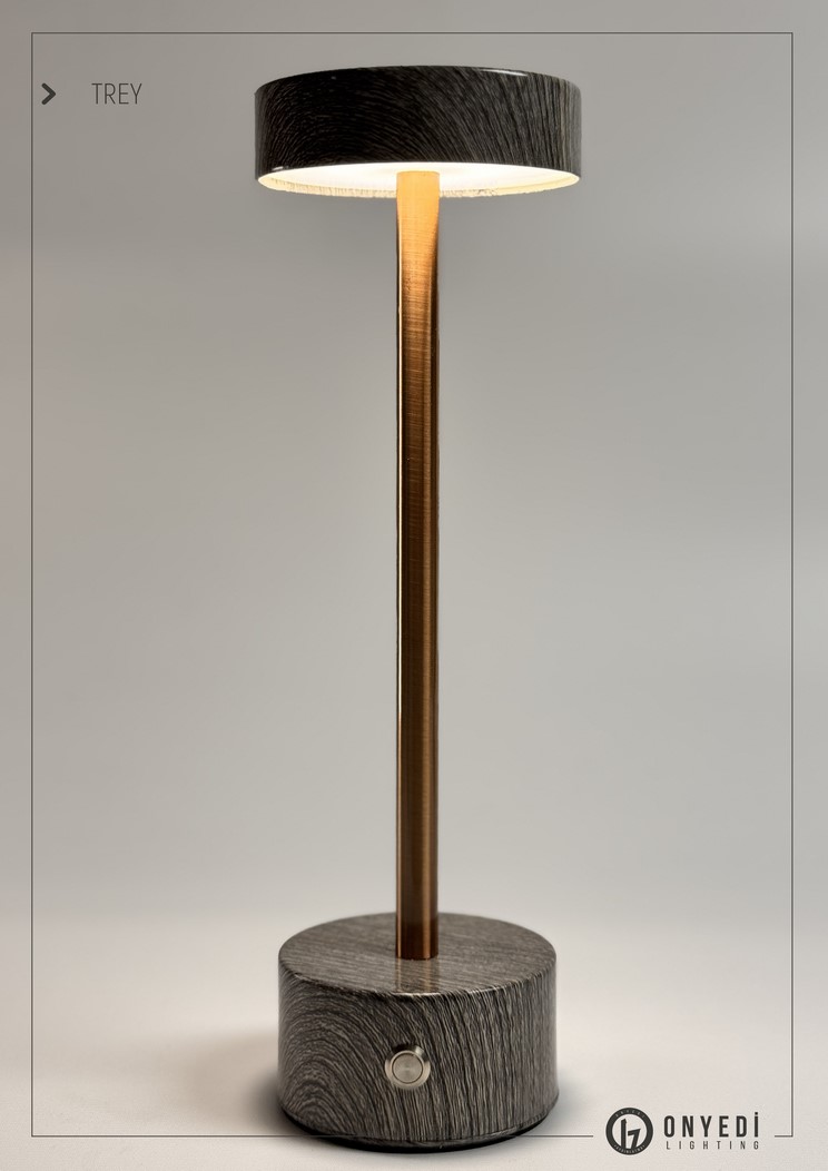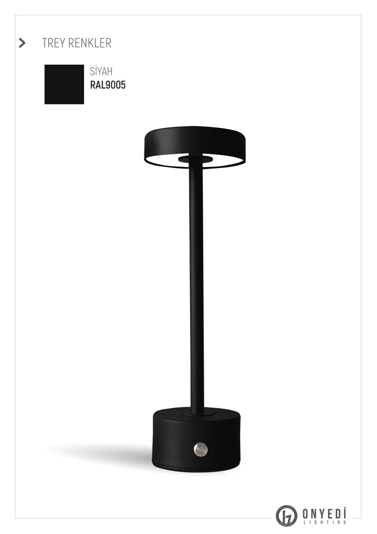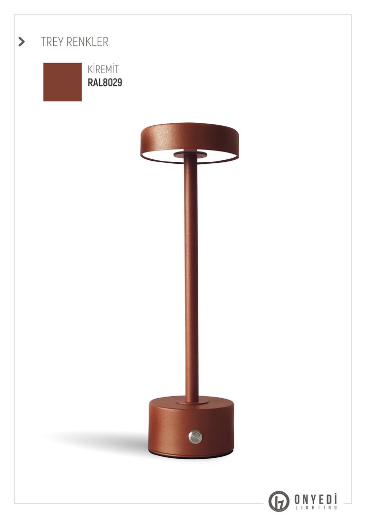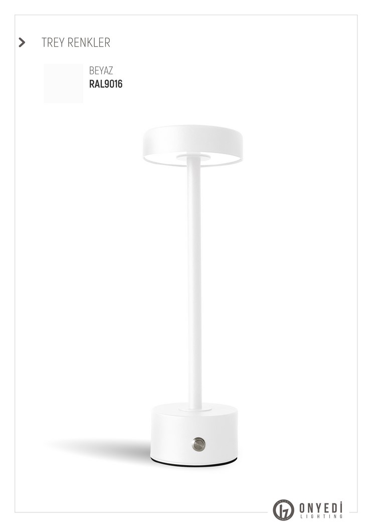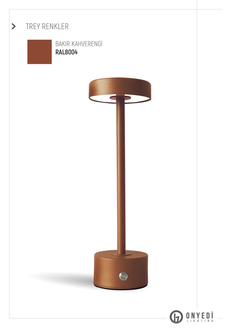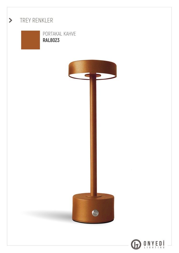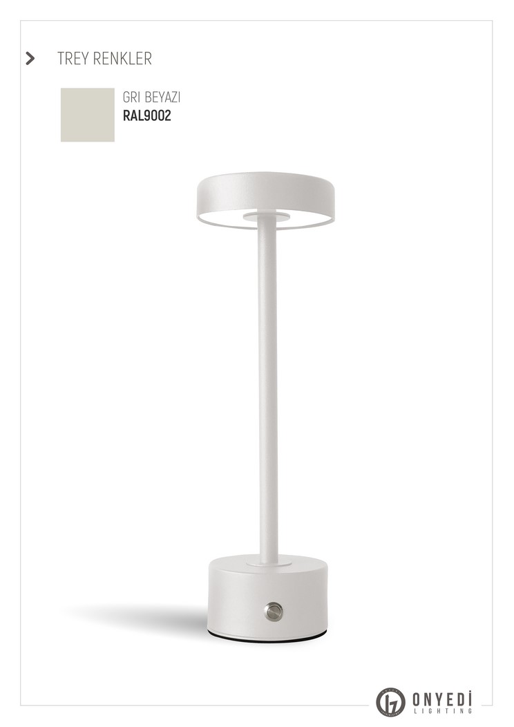 Firmamızın tasarım tescilli ürünü olan Trey şarjlı masa lambası 4400mah lityum ion bataryası ve 2.2Watt Samsung 2700Kelvin Led 200 lumen ışığı ile ihtiyacı gidermektedir. 3 kademeli dim edebilirsiniz. 1. kademe de 13 saat, 2.kademe de 19 saat ve 3.kademede 30 saat yanmaktadır. Toplu şarj istasyonu sayesinde 18, 24, 32, 40 ve 50 li gruplar halinde tek seferde şarj edebilirsiniz. Renk seçenekleri ve kaplama seçenekleri bulunmaktadır. Şarjlı masa lambası modellerimizin hepsi 3 yıl garantilidir. Opsiyonel olarak rgb ışık renkleri ve uzaktan kumanda özelliği eklenebilmektedir.